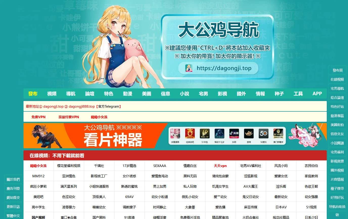 大公鸡导航是一个极具特色的成人资源站导航平台,集合了大量主流、热门、稀缺的成人视频资源入口,涵盖国内外各类精品站点。网站采用表格分类和模块化排布,用户可快速找到精品视频、各类女优资源站、无码、有码、亚洲、欧美、日韩等多类别入口,并附带实用资源站、福利工具、磁力搜索等辅助模块。页面风格二次元与简约蓝色为主,兼顾视觉活力与实用导向,是老司机寻找优质资源的首选聚合平台。