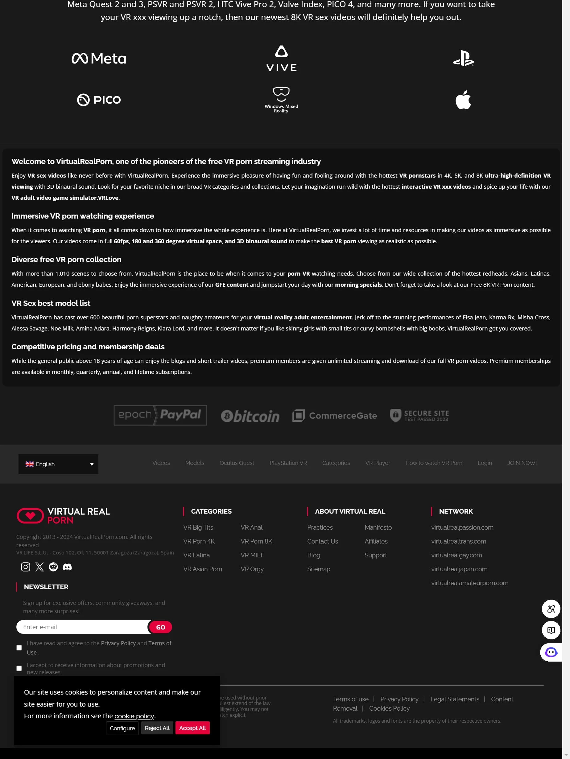 该网站是一个虚拟现实(VR)色情内容平台,提供高质量的VR色情视频。网站的定位明确,主打“真实感”和“独家内容”,吸引了对VR成人内容有兴趣的用户。网站主页展示了精选的视频和最热门的演员,突出其独特的内容优势。