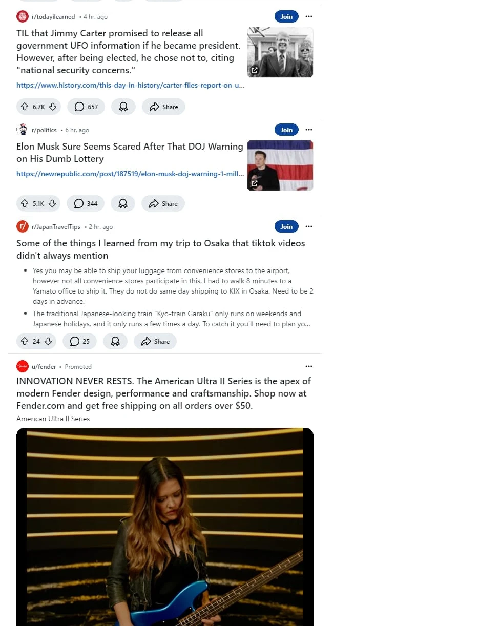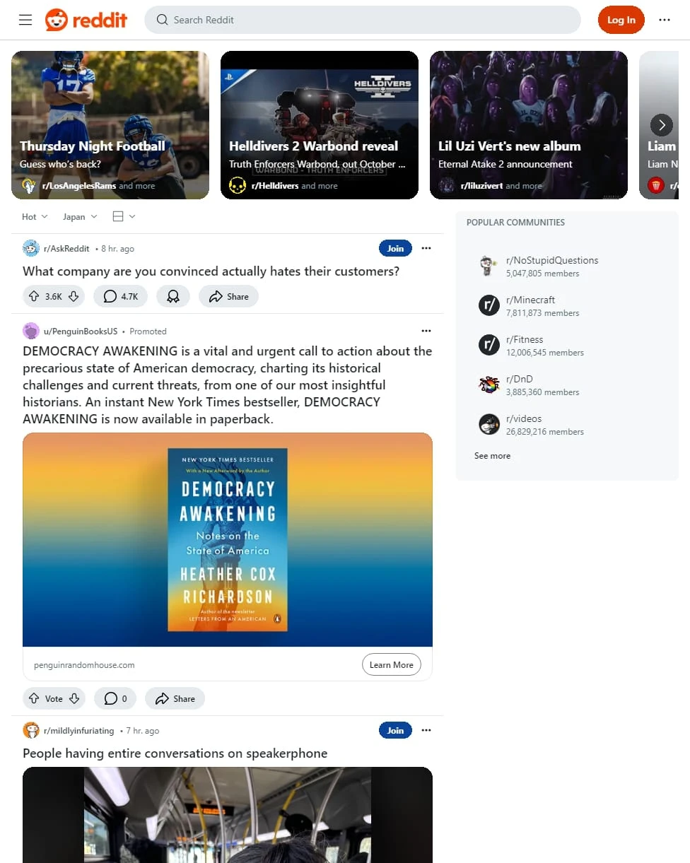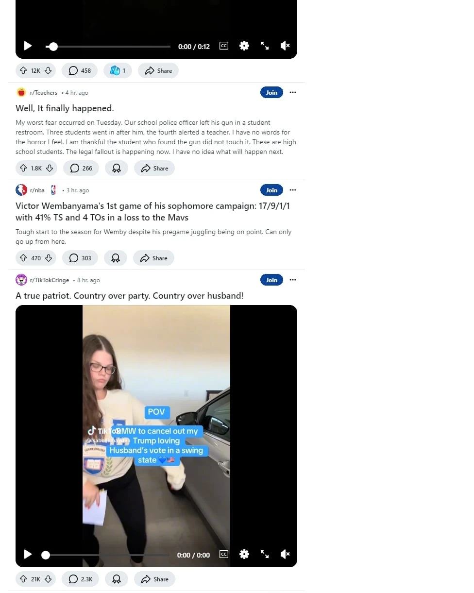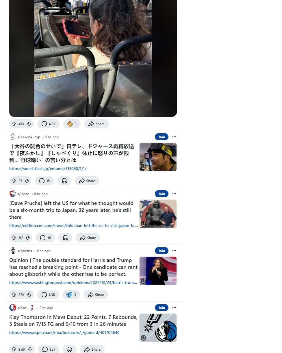 这是一个高度互动的社区分享平台,类似于 Reddit。该网站主要聚合用户生成的内容,涵盖政治、体育、娱乐、生活经验等广泛话题。网站界面简洁明快,以白色为主调,注重内容的可读性和用户互动。用户可以通过评论、投票和分享功能与帖子互动,增强了社区的参与感。