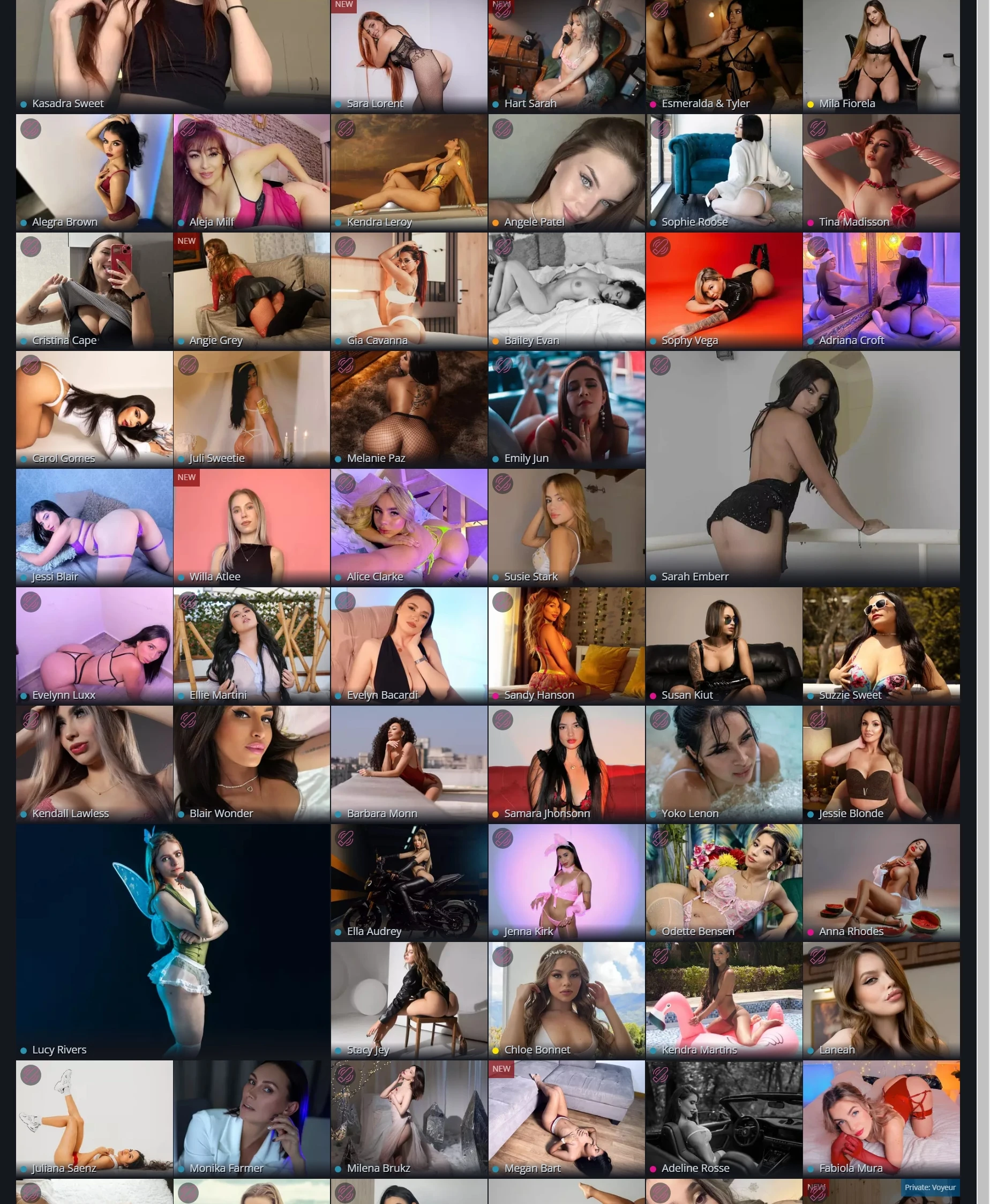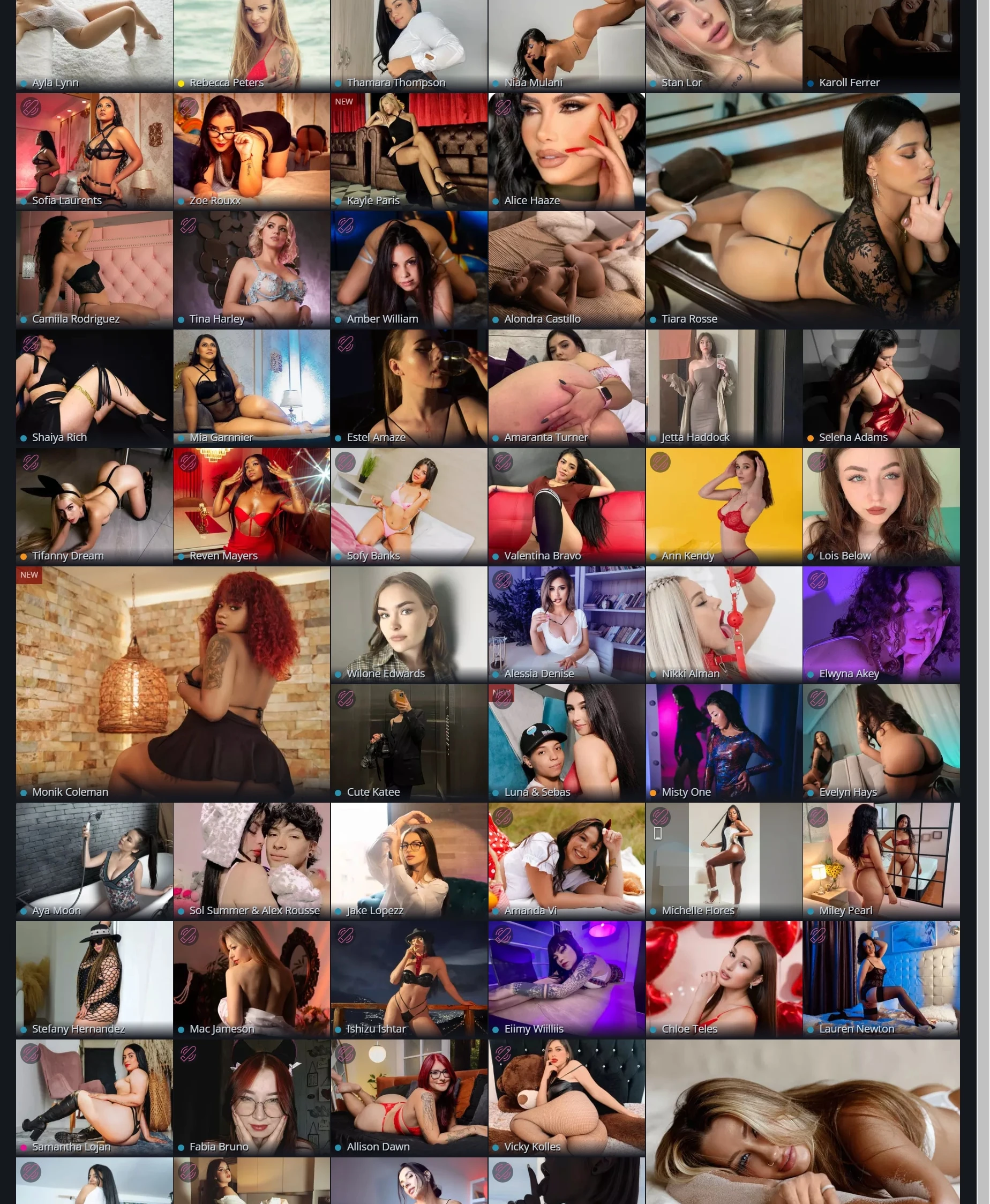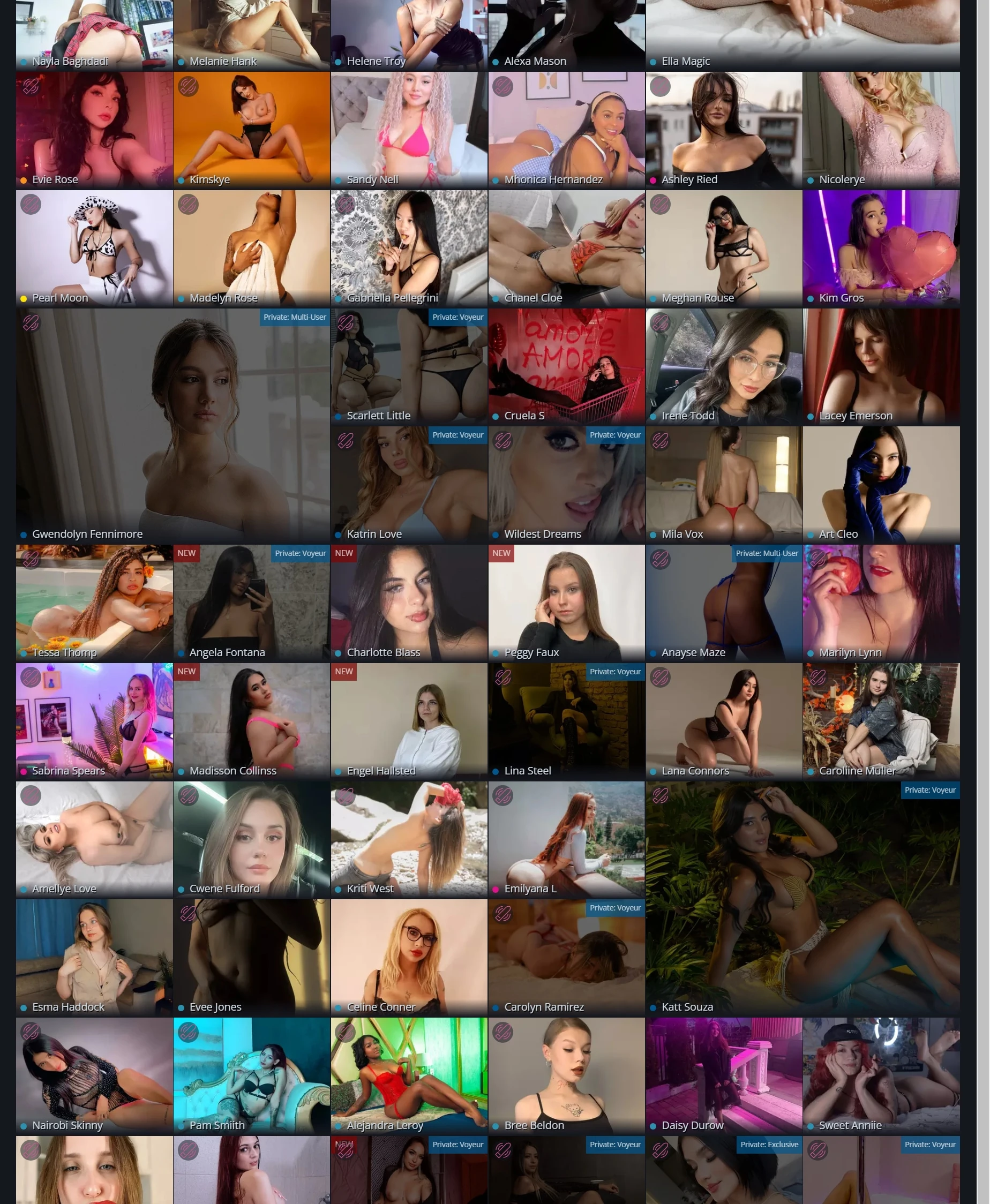 此网站聚焦于在线真人视频互动,展示了多位不同风格的模特和主播,为用户提供丰富的选择。页面布局以网格形式排列,展示每位模特的个人照片,用户可以轻松浏览和选择感兴趣的主播。整体风格现代、简洁,设计上突出了模特的照片,使用户在访问时便能直观地获取内容。