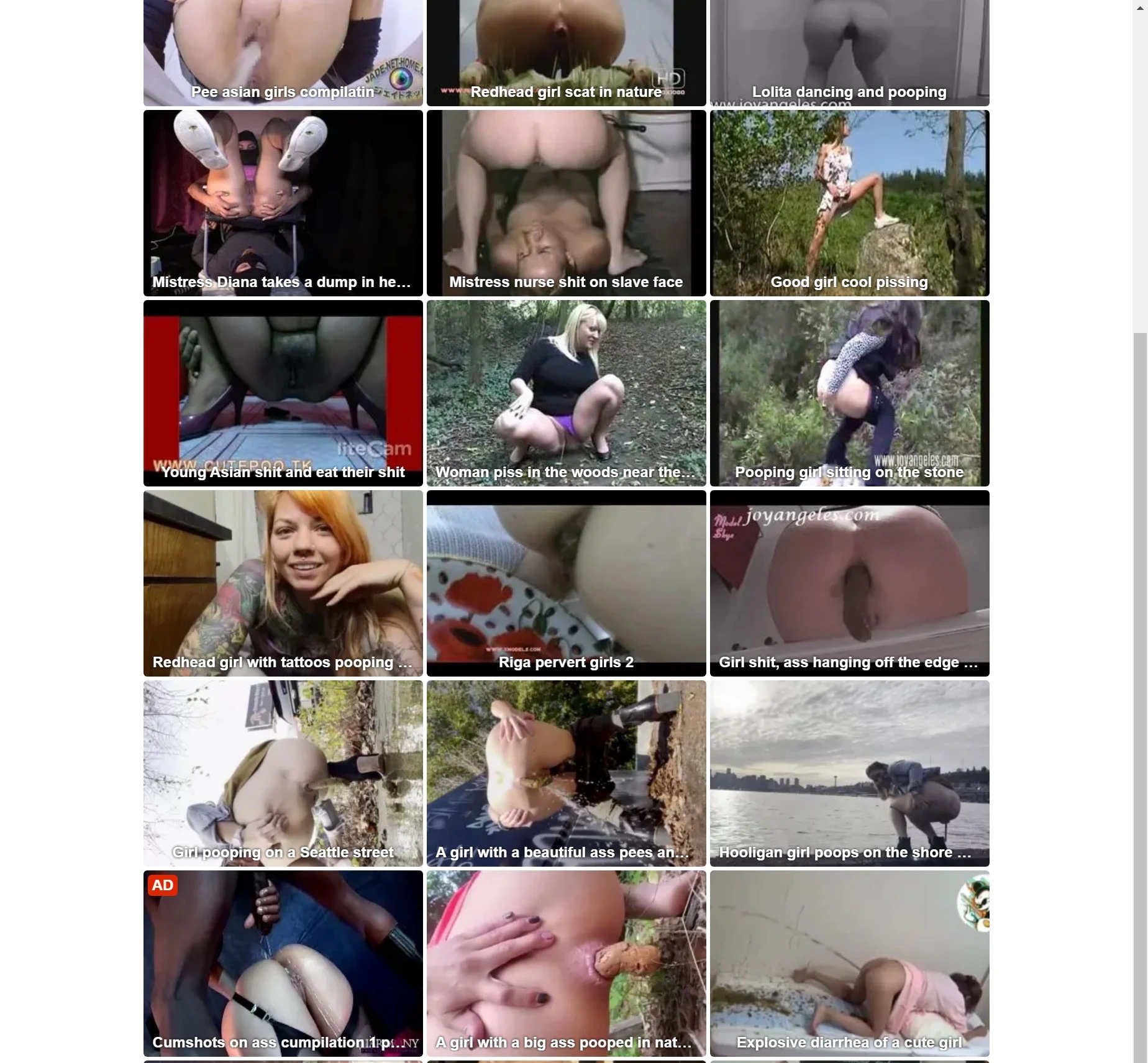 该网站的主题主要集中于特定类别的成人内容,主要以女性排便、排尿以及相关场景为主。该网站为用户提供了大量以“Scat”、“Poop”、“Pee”等内容为主的视频资源,并且每个视频都配有相应的预览图及简短的文字描述。这类内容属于极其小众且特定的成人兴趣类型,因此吸引的是对此类题材感兴趣的用户群体。