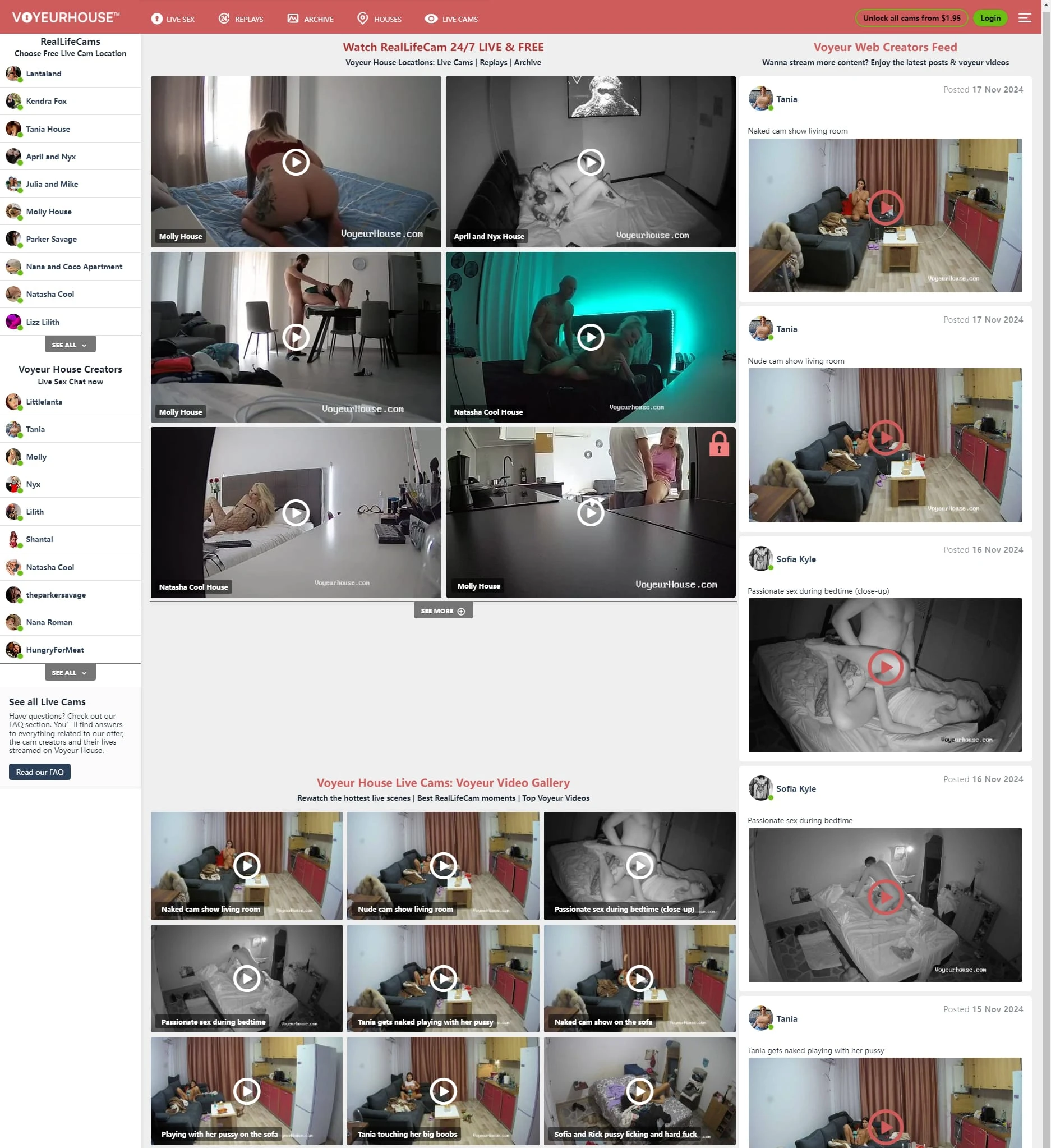 Voyeur House 是一个实时监控和隐藏摄像头视频平台,主打将日常生活的真实场景直播给观众。用户可以通过平台观看来自多个房间和公寓的直播视频,捕捉真实生活中的瞬间。该网站以"偷窥"和"实时生活"为卖点,吸引了一大批对这种内容形式感兴趣的观众。