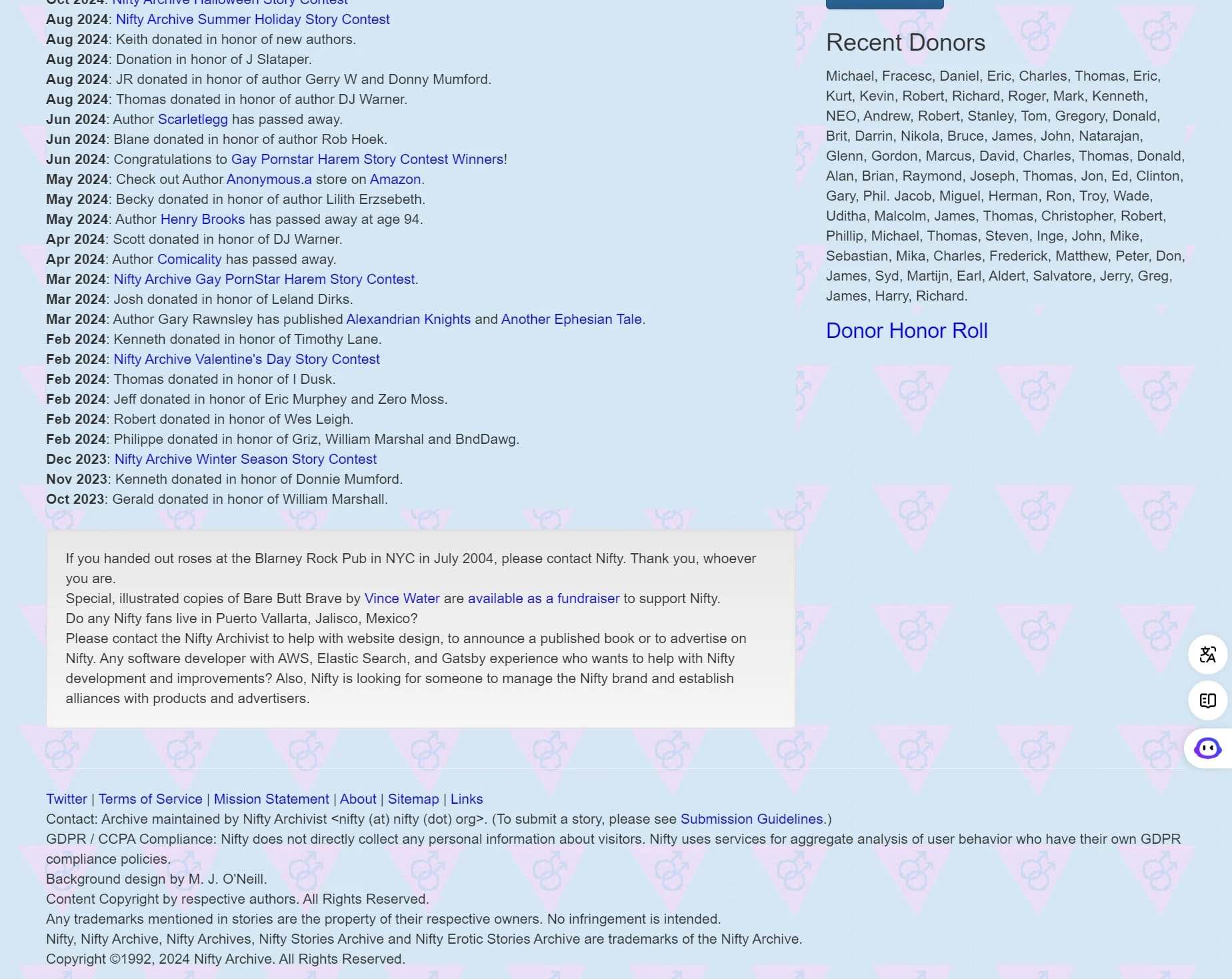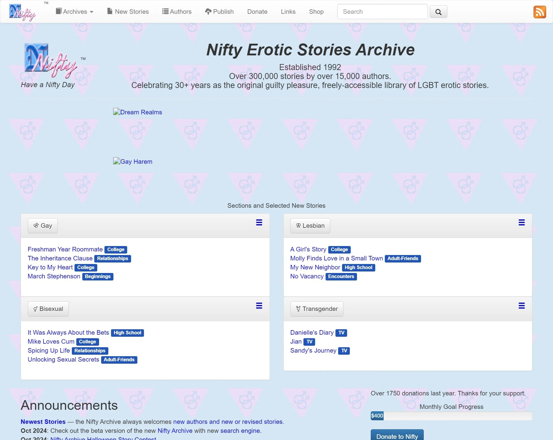 Nifty Erotic Stories Archive 是一个历史悠久的、专注于 LGBTQ+ 题材的情色故事在线图书馆。自 1992 年以来,该网站已经累积了超过 30 万个故事,来自 15,000 多名作者。它提供免费的内容,专注于不同性别和性向的故事分类,覆盖了男同性恋、女同性恋、双性恋和跨性别等题材。