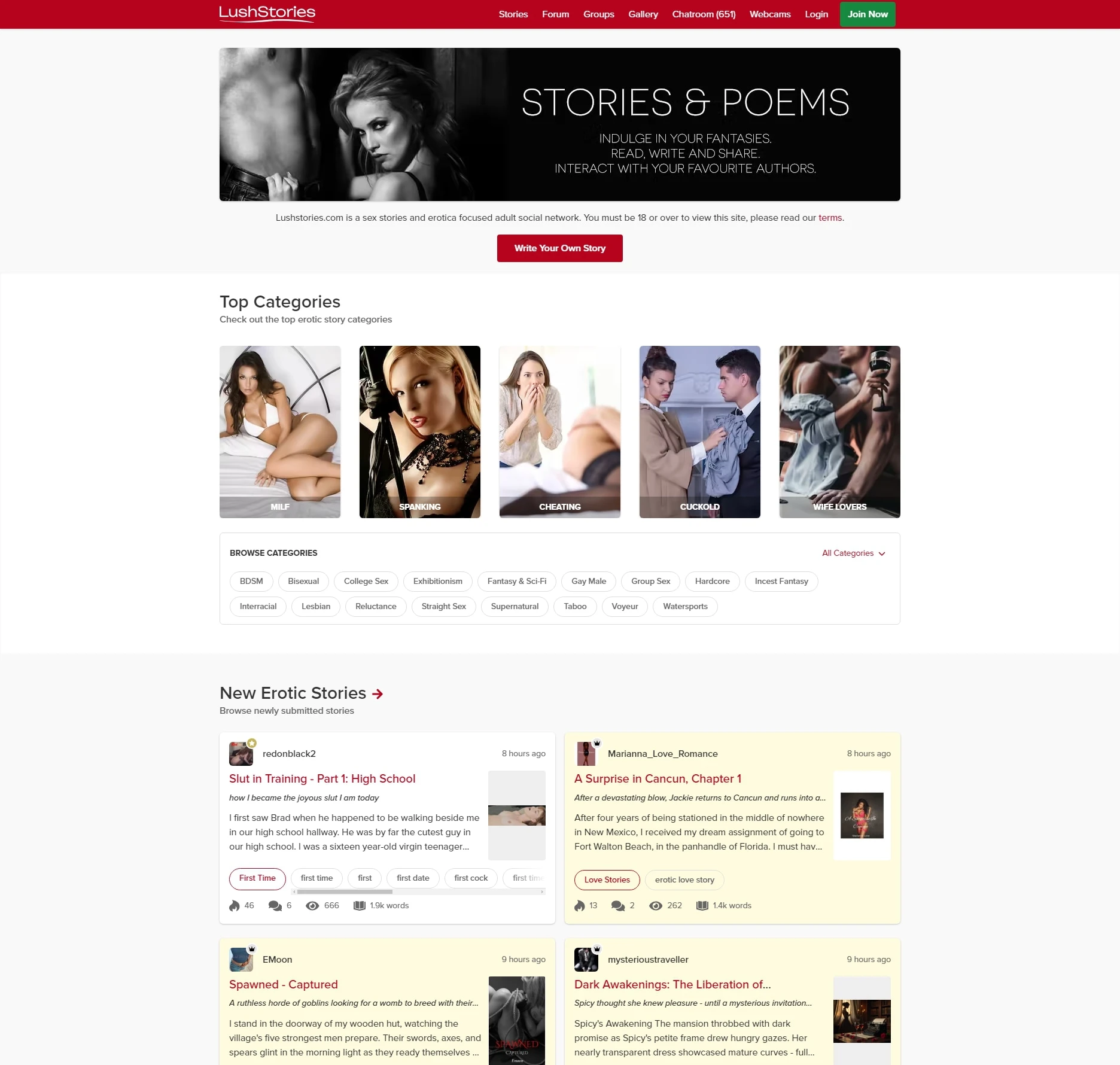 Lush Stories 是一个以成人文学为核心的在线社交网络,专注于为用户提供丰富的色情故事、诗歌以及相关的互动社区服务。该网站允许用户阅读、撰写和分享原创内容,同时通过论坛、聊天功能和成员互动促进社交体验。其内容涵盖多种类别,从轻微挑逗到深度情色,满足了不同用户的审美和需求。