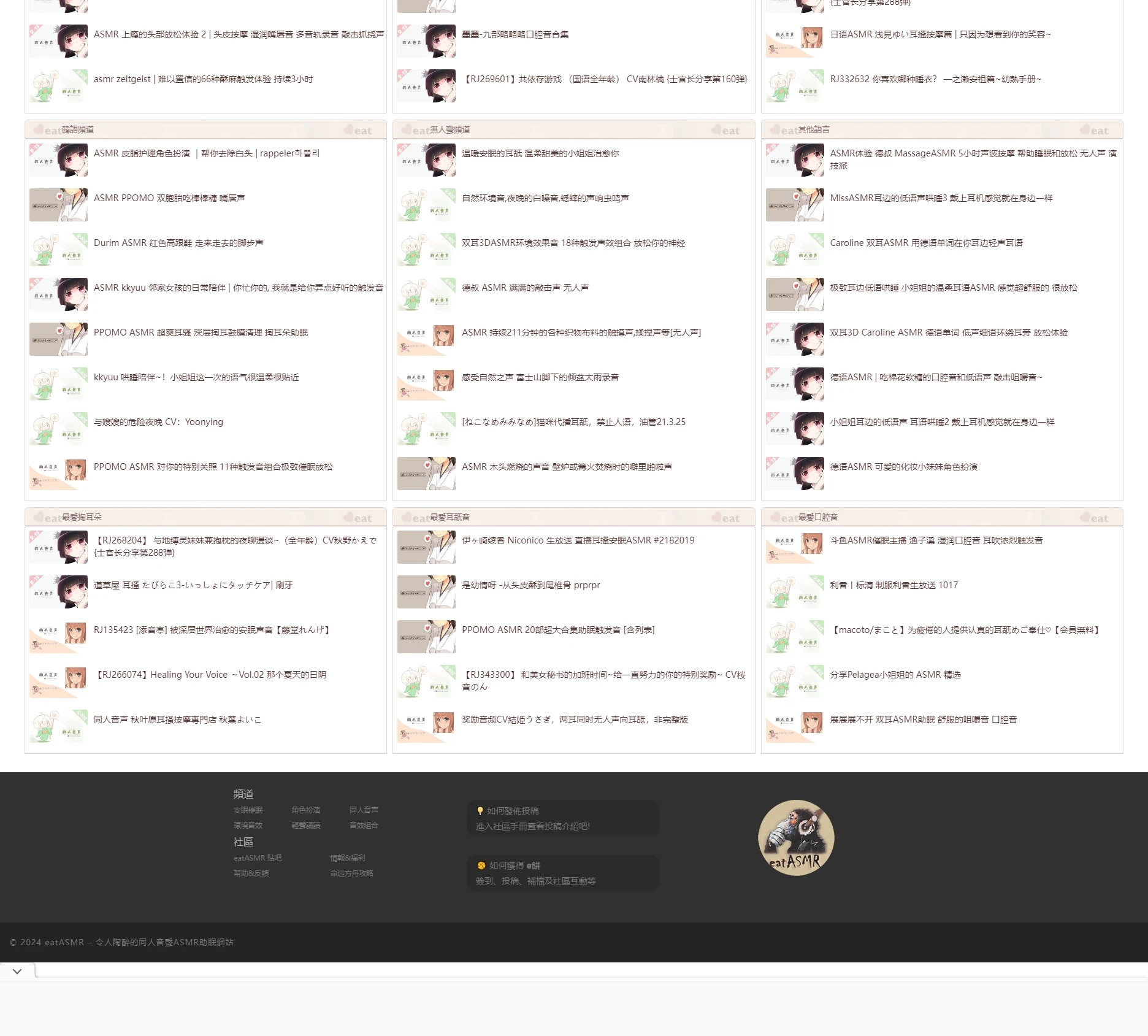 eatASMR 是一个以 ASMR 内容为核心的多功能社区网站,旨在为用户提供放松、减压的音频与视频资源,同时打造一个互动性强、主题明确的兴趣交流平台。网站不仅汇集了海量高质量的 ASMR 资源,还通过社区功能连接了拥有相同兴趣爱好的用户,形成一个紧密联系的用户群体。