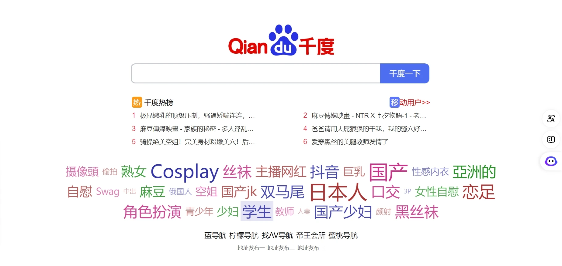 该网站的名称为“千度”,以搜索引擎的形式呈现,提供了热门搜索、关键词推荐、内容导航等服务。页面设计简单,配有搜索栏、热榜内容以及云标签等模块,旨在引导用户探索不同类别的内容。此网站面向内容搜索和导航,主要集中在某些特定的热门内容领域。